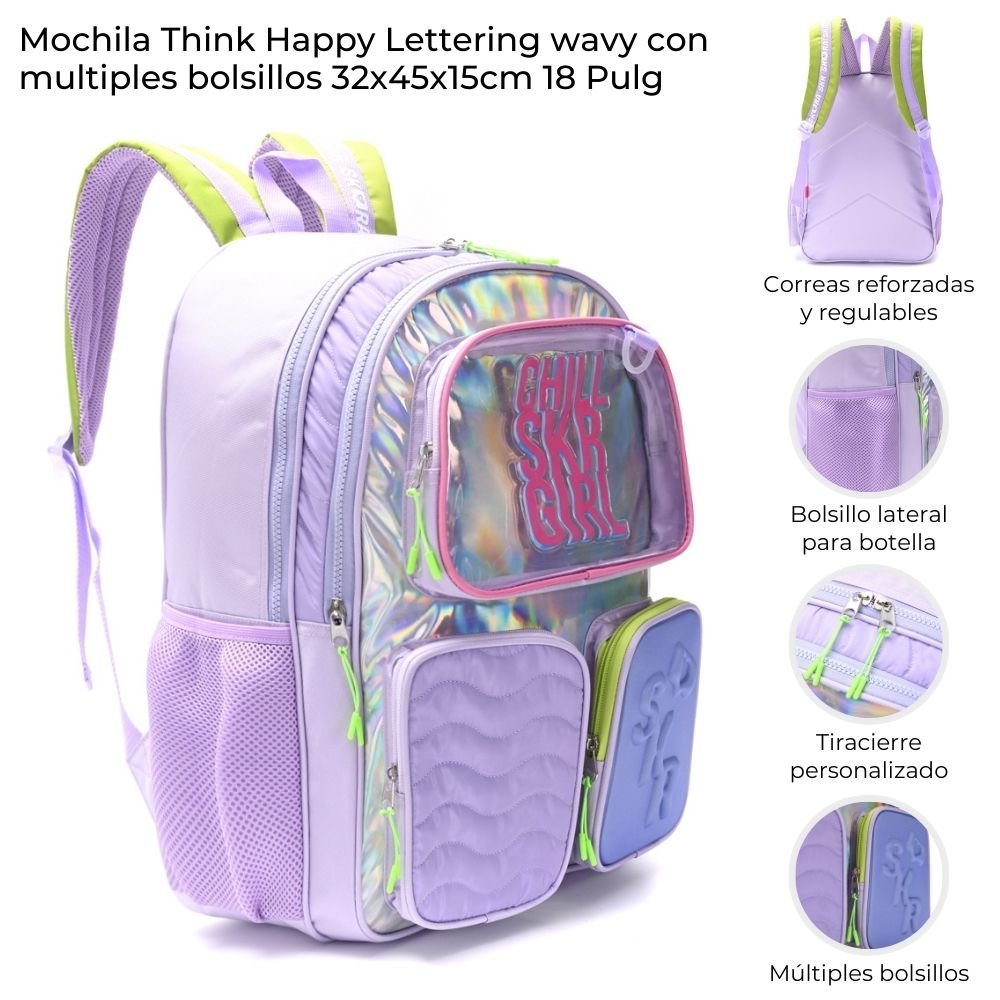 Mochila Think Happy Lettering wavy con múltiples bolsillos