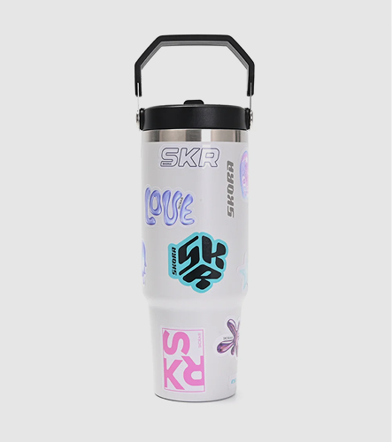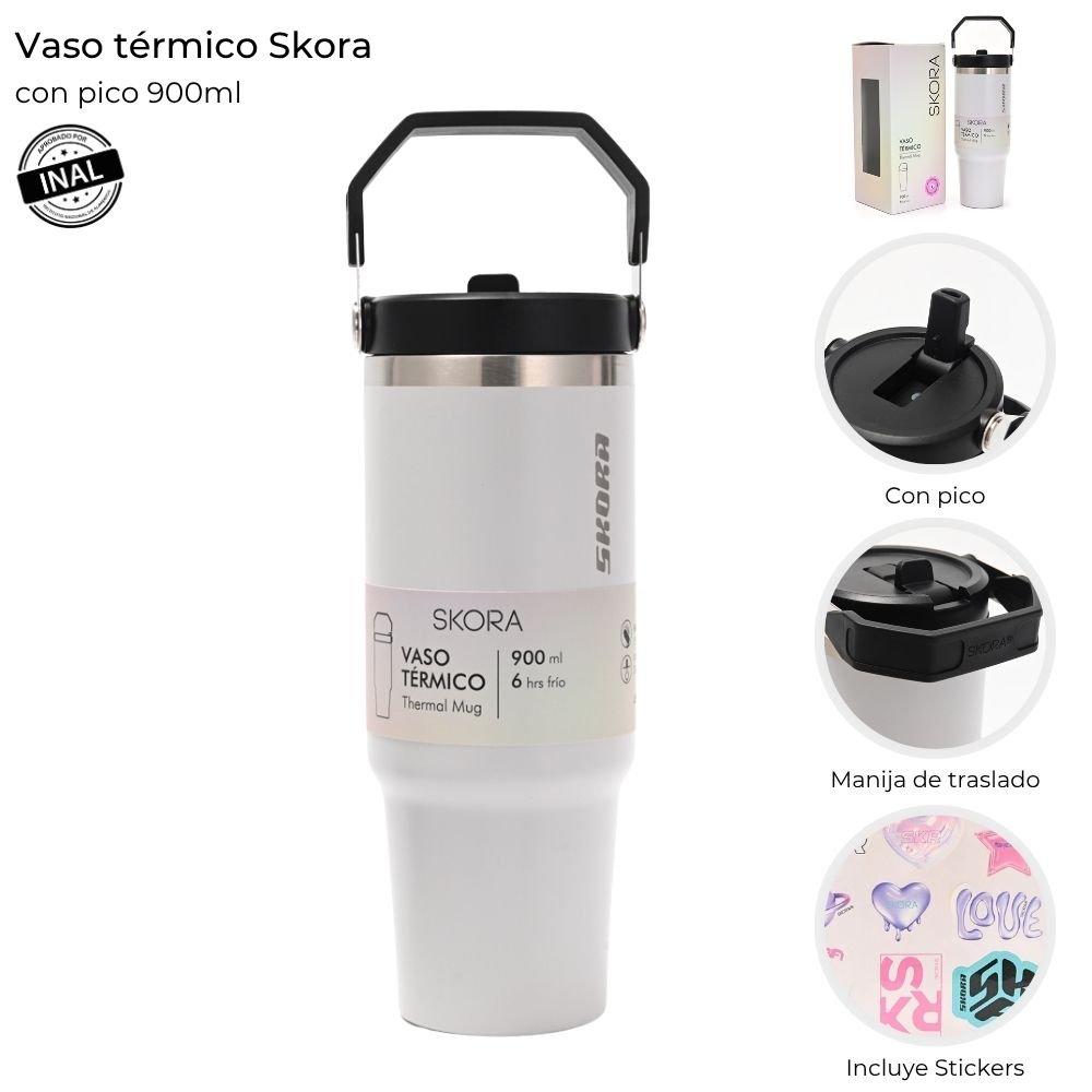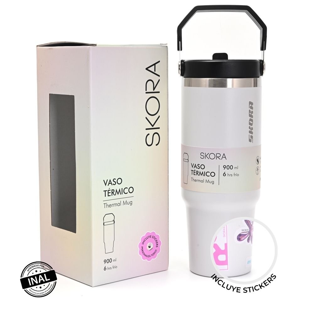 Vaso térmico Skora 900 ml: práctico y lleno de estilo. Incluye stickers para que lo personalices y lo hagas único.